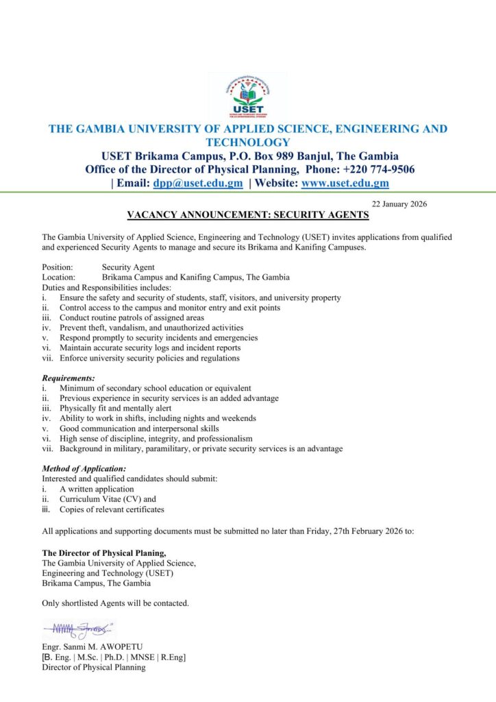 The Gambia University of Applied Science, Engineering and Technology (USET) invites applications from qualified and experienced Security Agents to manage and secure its Brikama and Kanifing Campuses.